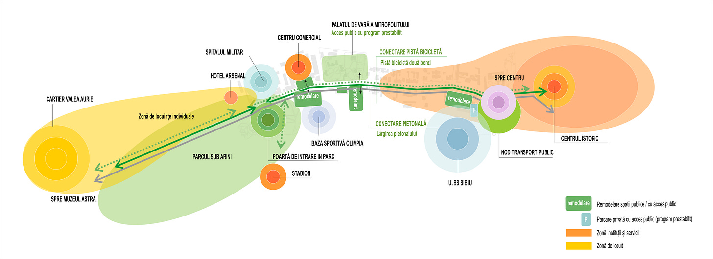 Prin Asociația pentru Înfrumusețarea Orașului Sibiu (AIOS) am reușit să convingem administrația că sună bine o promenadă care să facă legătura între Centrul Istoric și Parcul Sub Arini, cel mai important parc al orașului. Astfel, echipa ce a gândit anul acesta Planul de Mobilitate Urbană Durabilă a inclus proiectul nostru în documentațiile ce ajută la accesarea fondurilor europene, denumindu-l Coridor de mobilitate durabilă.