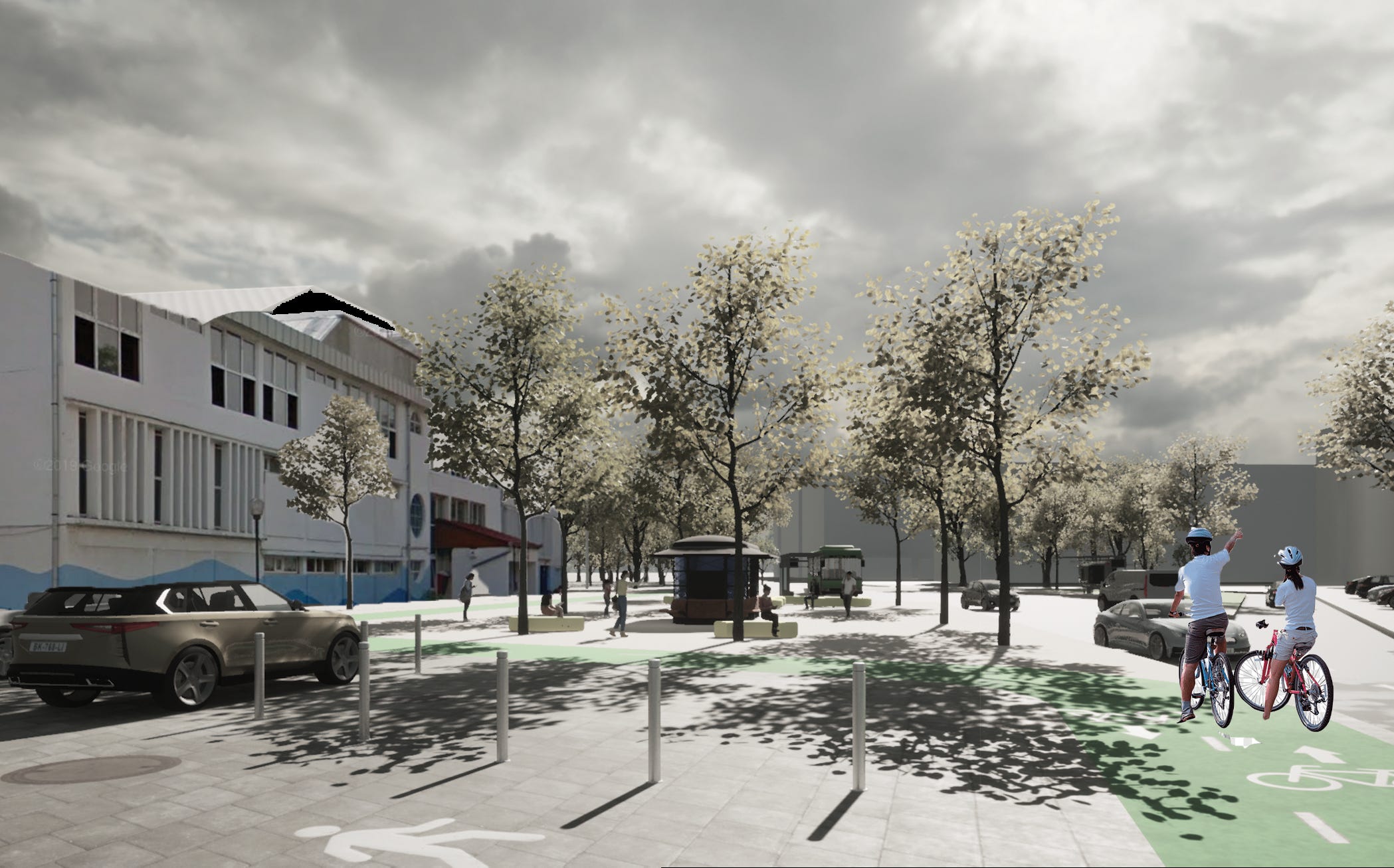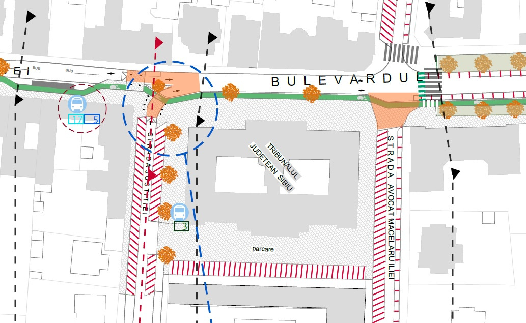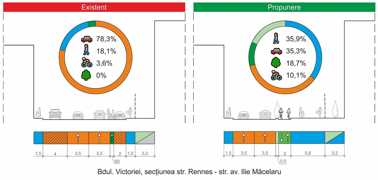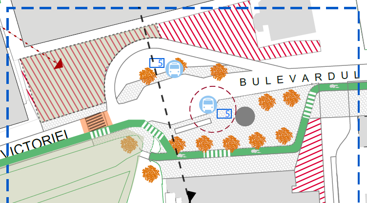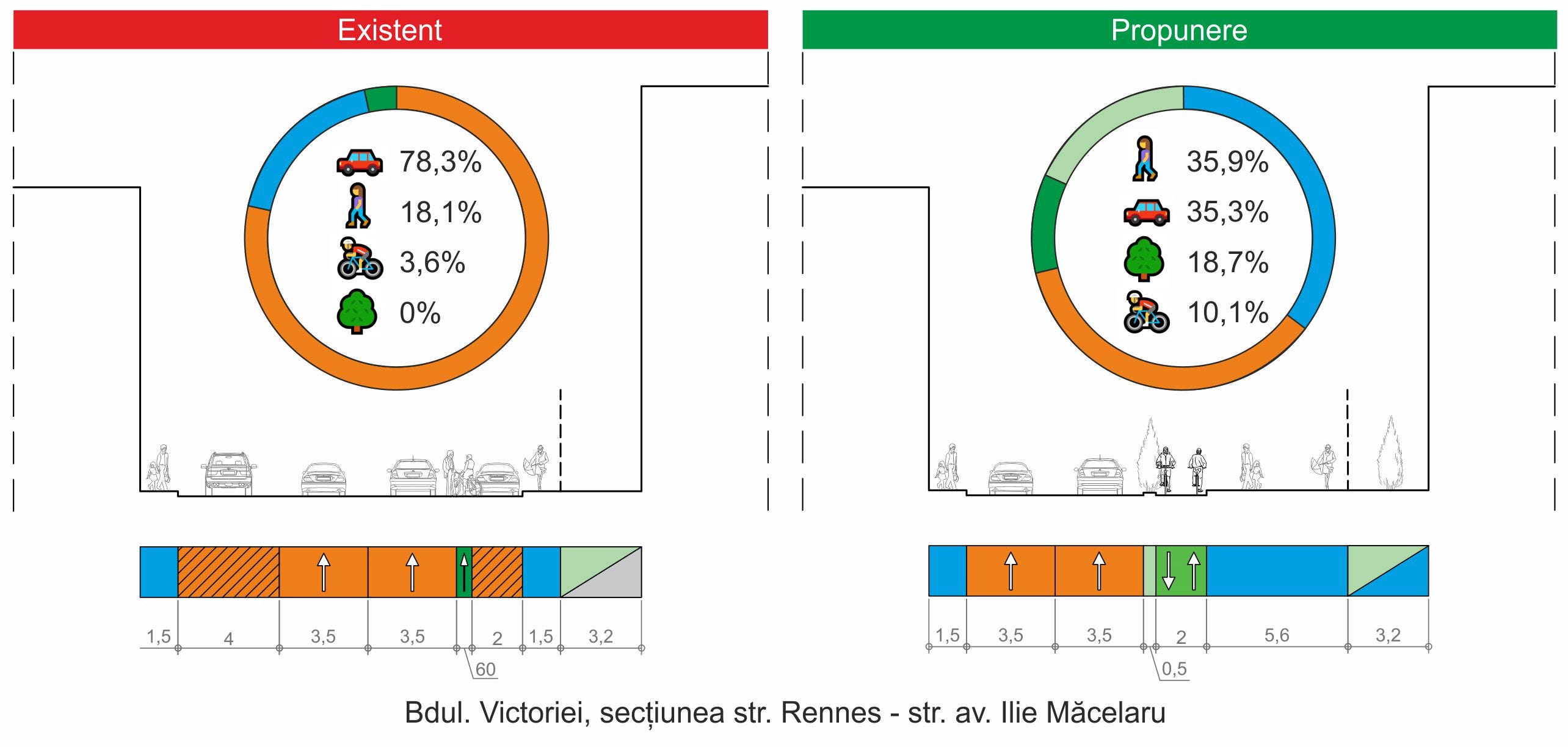 În ceea ce privește parcările existente acum de-a lungul bulevardului Victoriei, proiectanții propun ca desființarea a circa 17 locuri de parcare aflate între străzile Rennes și Justiției să facă loc unei noi stații de autobuz, care să încurajeze deplasarea cu transportul în comun, iar spre str. Rennes trotuarul să poată fi lățit pe toată porțiunea ocupată acum de mașini parcate.