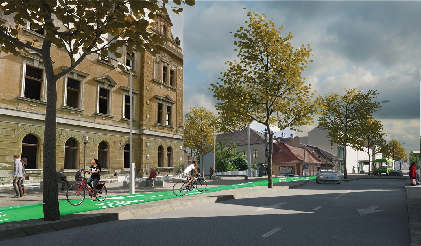 Piste de biciclete în dublu sens - pod suspendat în Piața Unirii