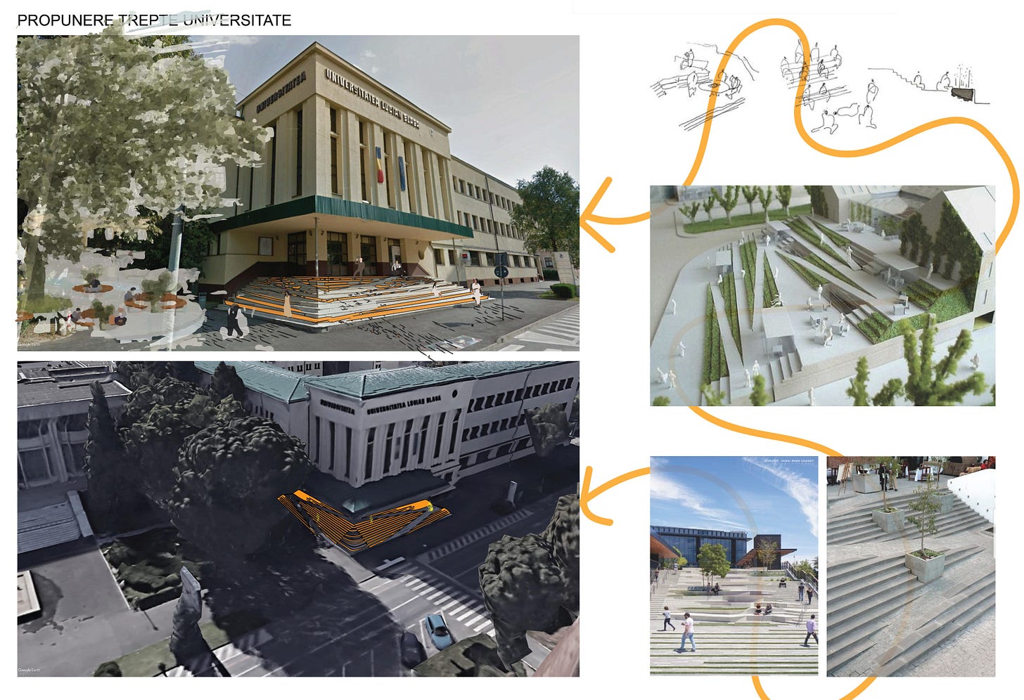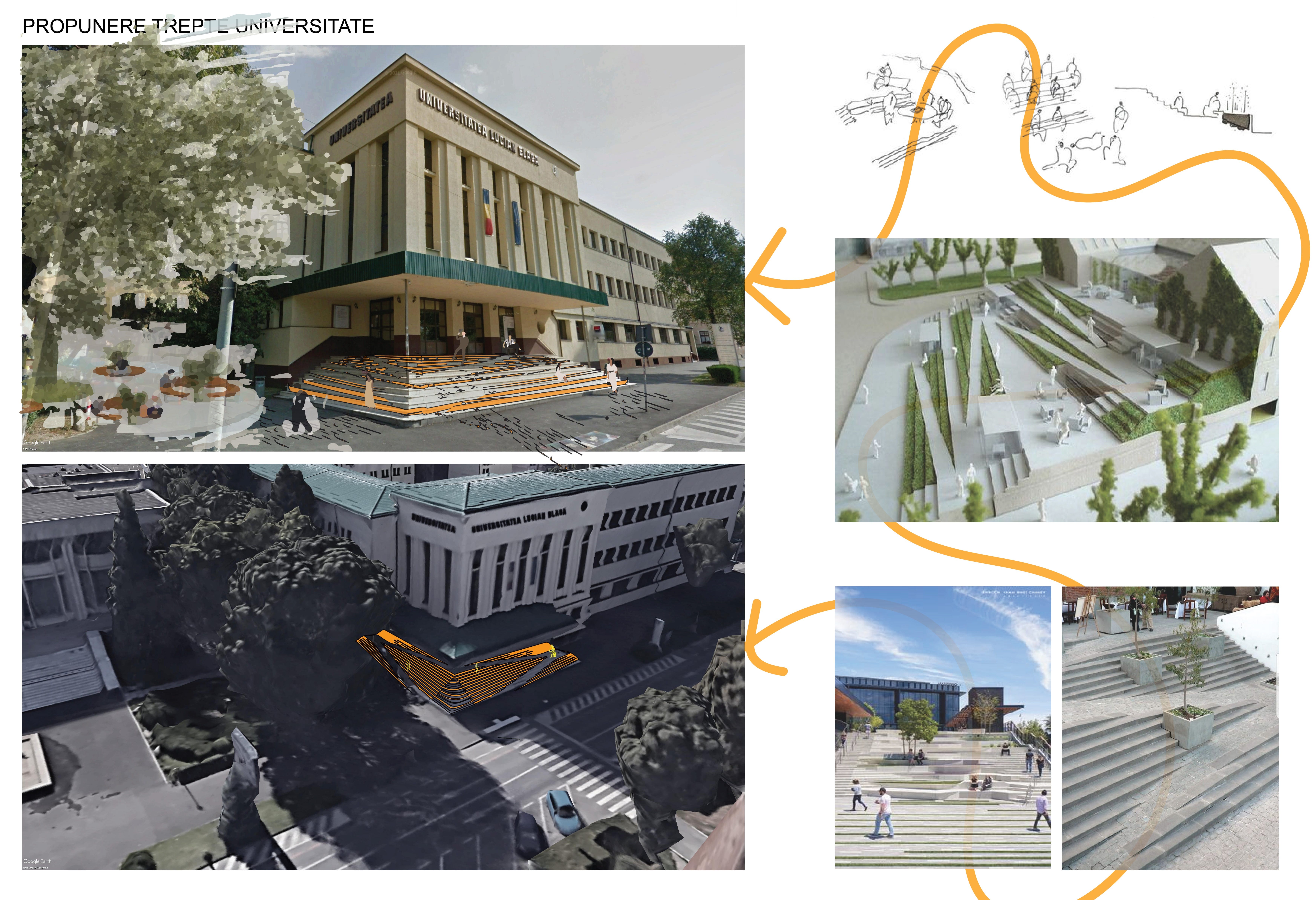 Scările de la intrarea în Universitatea Lucian Blaga, dar și piațeta din fața Cercului Militar sunt și ele subiectul unei propuneri de transformare. Scările ar putea fi remodelate astfel încât, pe lângă rolul funcțional, să poată deveni și spațiu de întâlnire. Prin integrarea unei rampe de acces pentru persoanele cu probleme locomotorii și prin transformarea parțială a treptelor în gradene zona de acces în Facultatea de Litere și Arte poate deveni din obstacol o zonă căutată, dedicată întâlnirilor. Mai ales dacă transformarea va fi corelată cu o eventuală reorganizare a piateței din fața Cercului Militar într-una în care să se poată organiza evenimente cu largă participare a publicului, spun proiectanții.