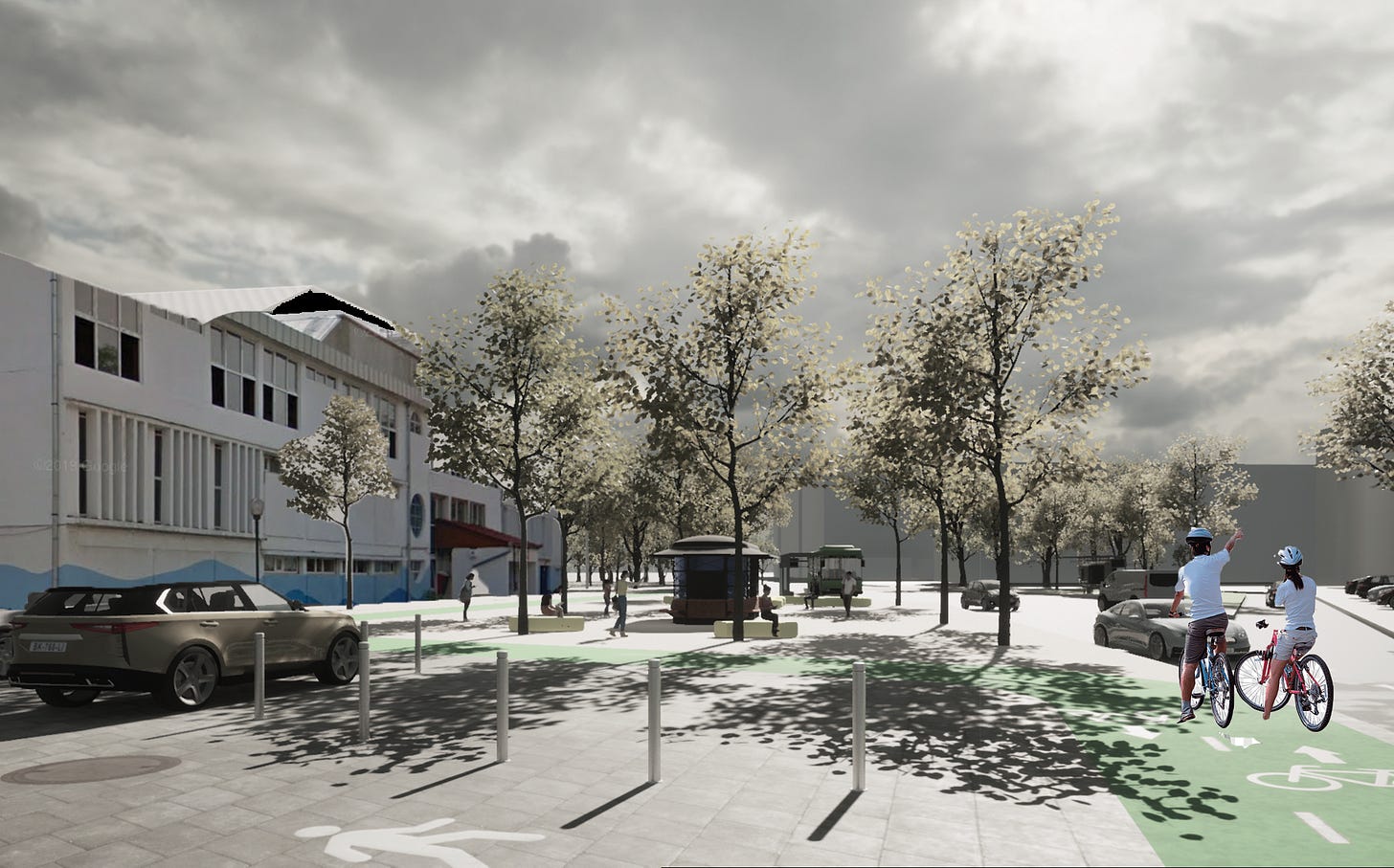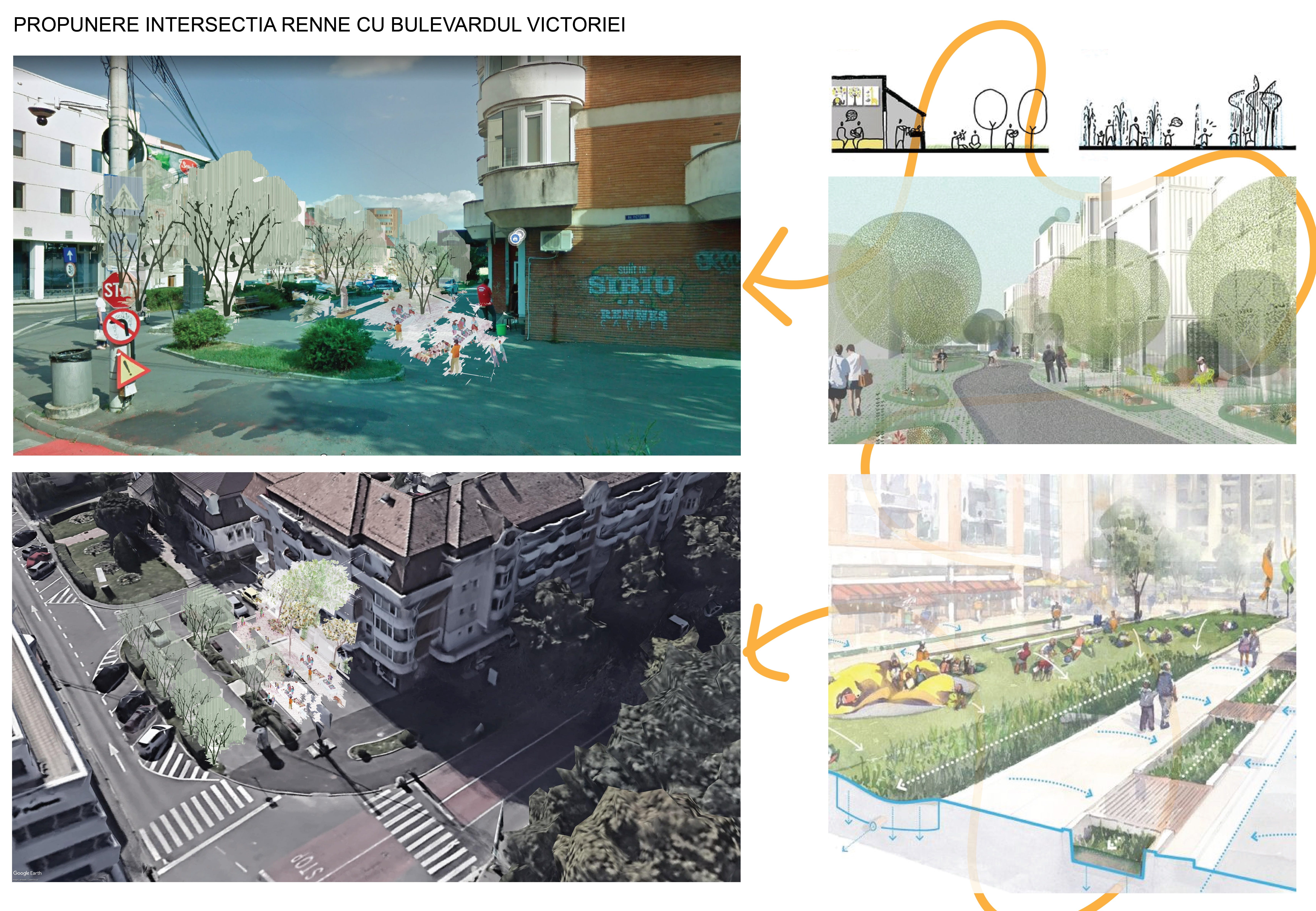 Transformarea spațiului public generos aflat la intersecția străzilor Transilvaniei-Victoriei-Rennes într-o piațetă verde poate oferi o altă zonă atractivă, destinată relaxării. Participanții propun aici plantarea mai multor arbori, schimbarea pavimentului într-unul prietenos cu pietonii, amplasarea mai multor bănci și poate chiar și construirea unei fântâni arteziene ori a unui luciu de apă.