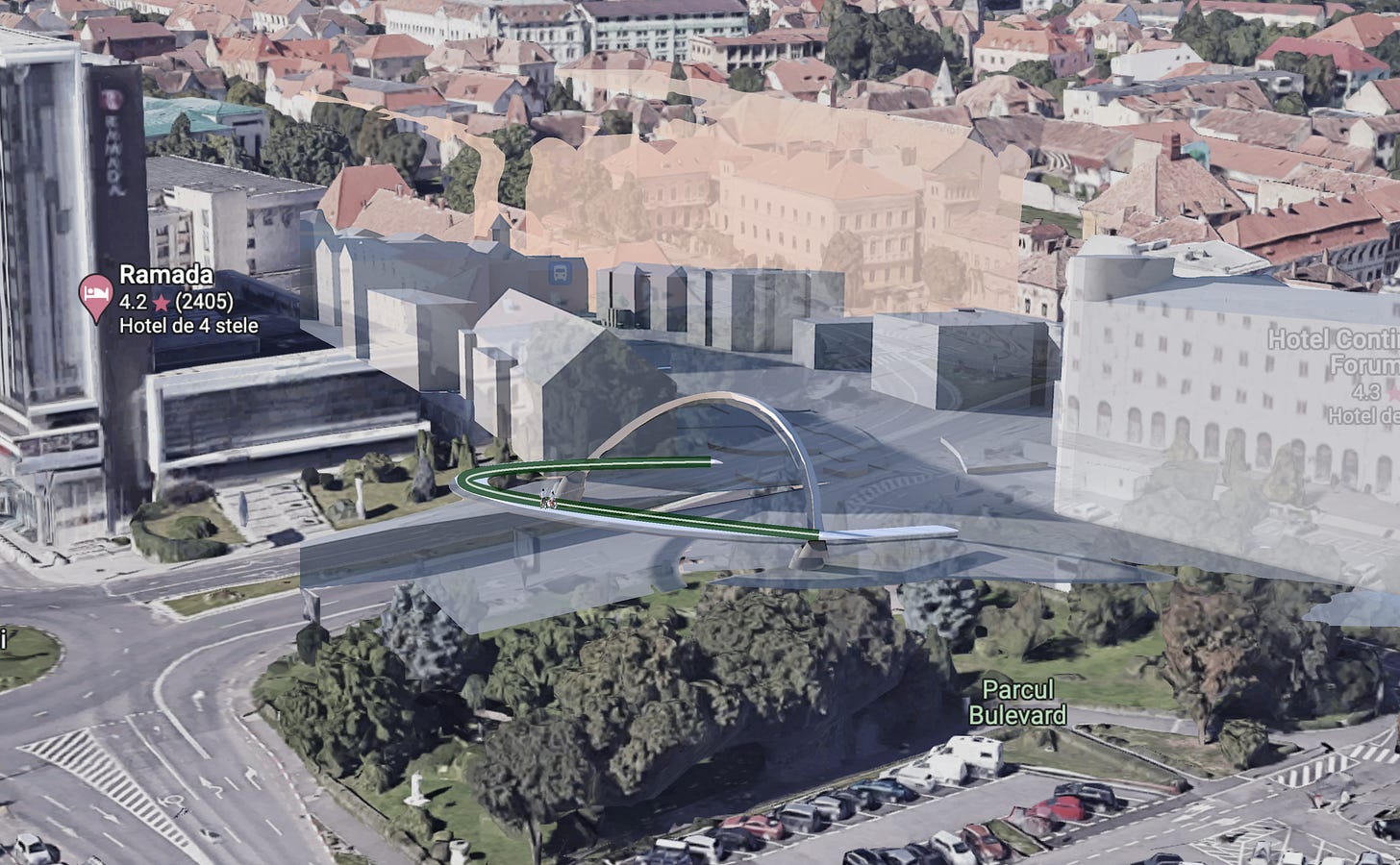 Pentru realizarea legăturii cu Piața Unirii, proiectanții vin și cu o propunere îndrăzneață: realizarea unui pod contrabalansat, semicircular, destinat bicicliștilor, care ar urma să lege suprateran zona din fața hotelului Continental Forum cu primăria veche. Podul ar putea fi construit ca o structură ușoară, fără piloni de susținere care să încurce traficul auto.