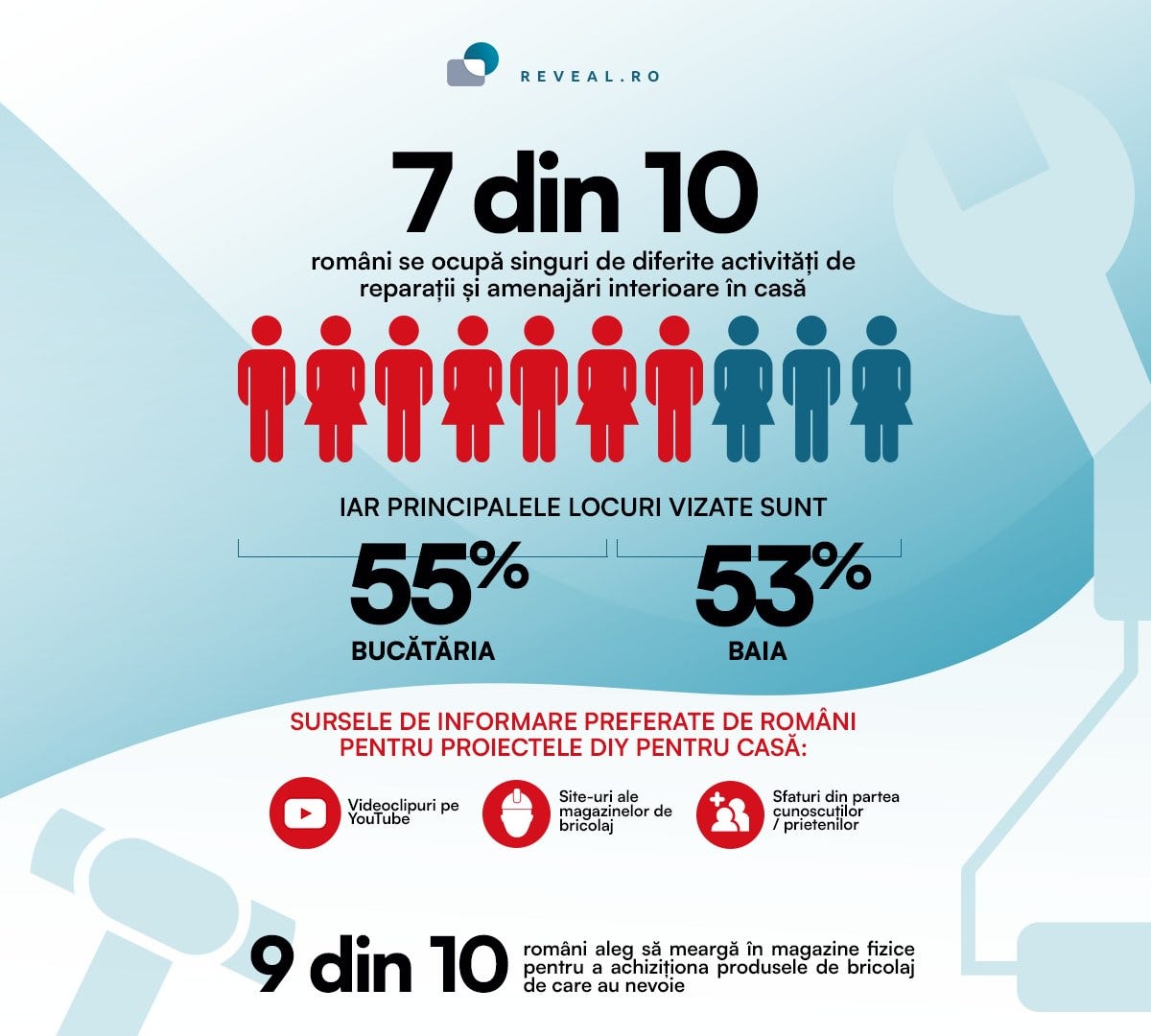 Un studiu recent arată că 7 din 10 români se ocupă singuri de diferite activități de reparații și amenajări interioare în casă. Ei se informează în general online, urmărind clipuri de pe YouTube (45%) sau site-urile magazinelor de bricolaj (40%) - Link